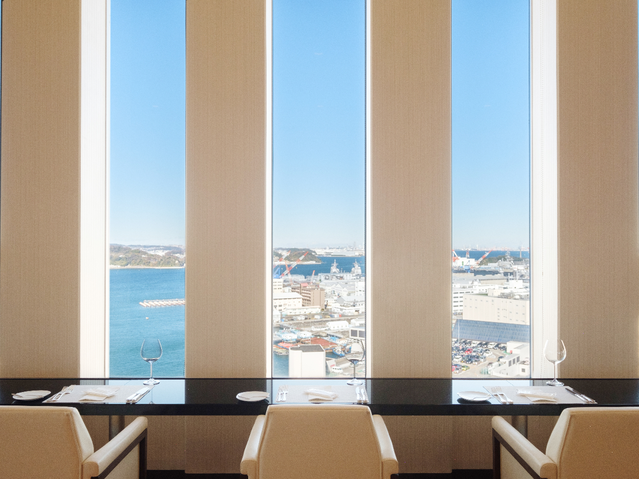 ■19階に位置し大きなガラス張りの窓からは房総半島や富士山を望み、横須賀港を見下ろす最高な眺望。