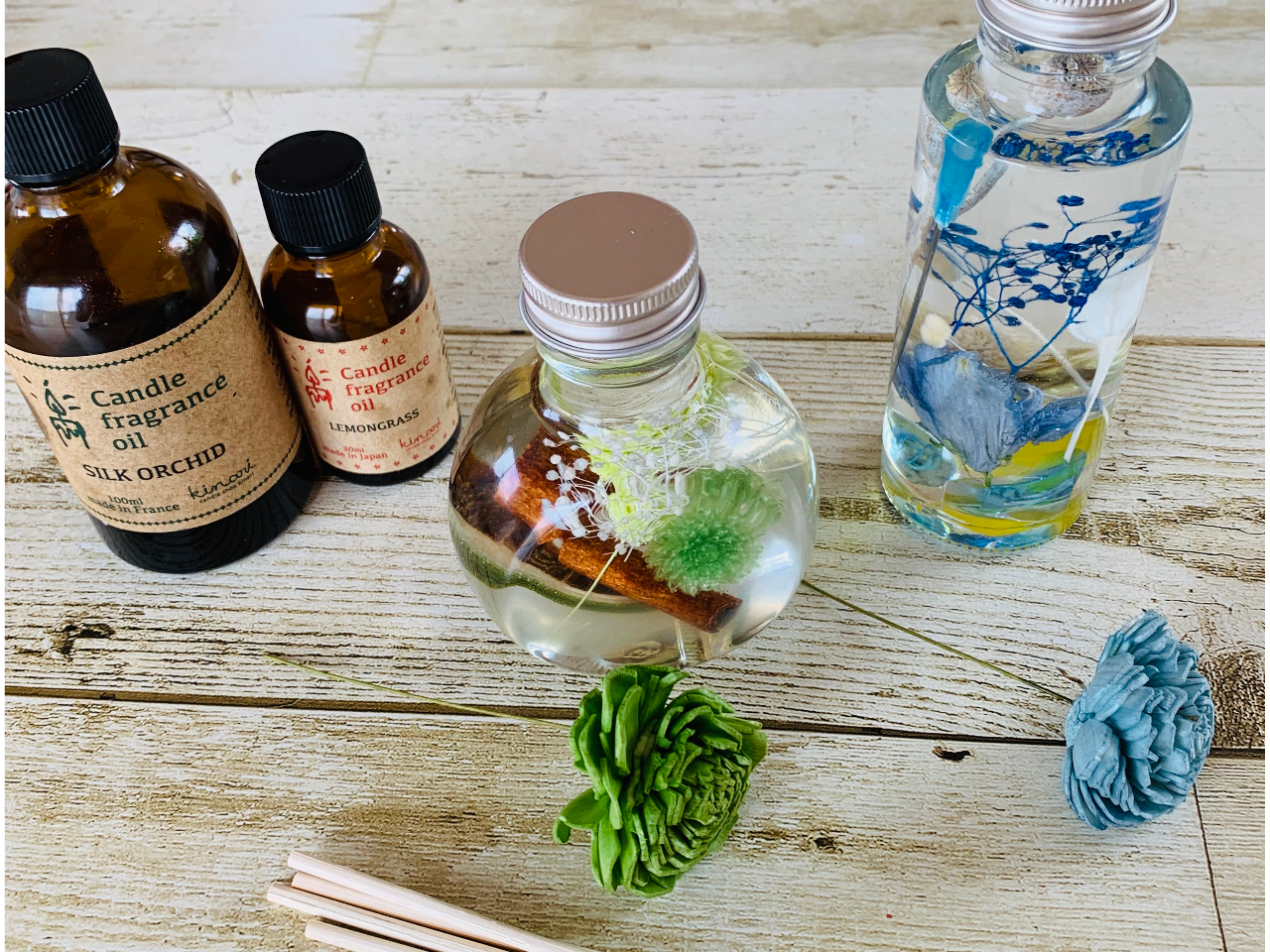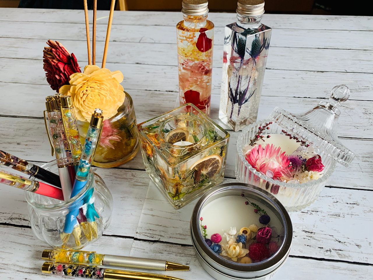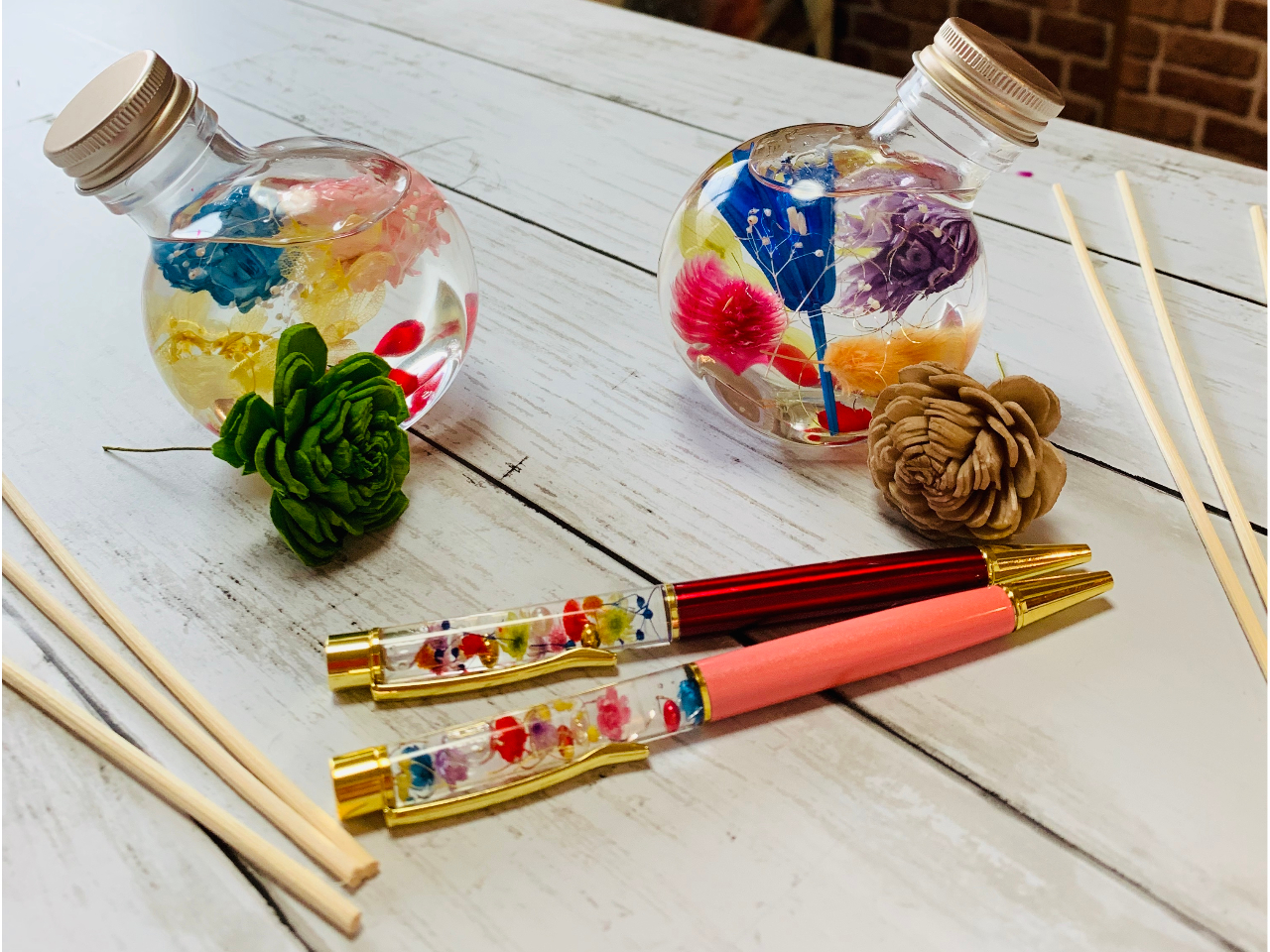 人気のハーバリウムを使って、見た目も香りもお洒落なルームディフューザー&ハーバリウムボールペンを作りましょう。