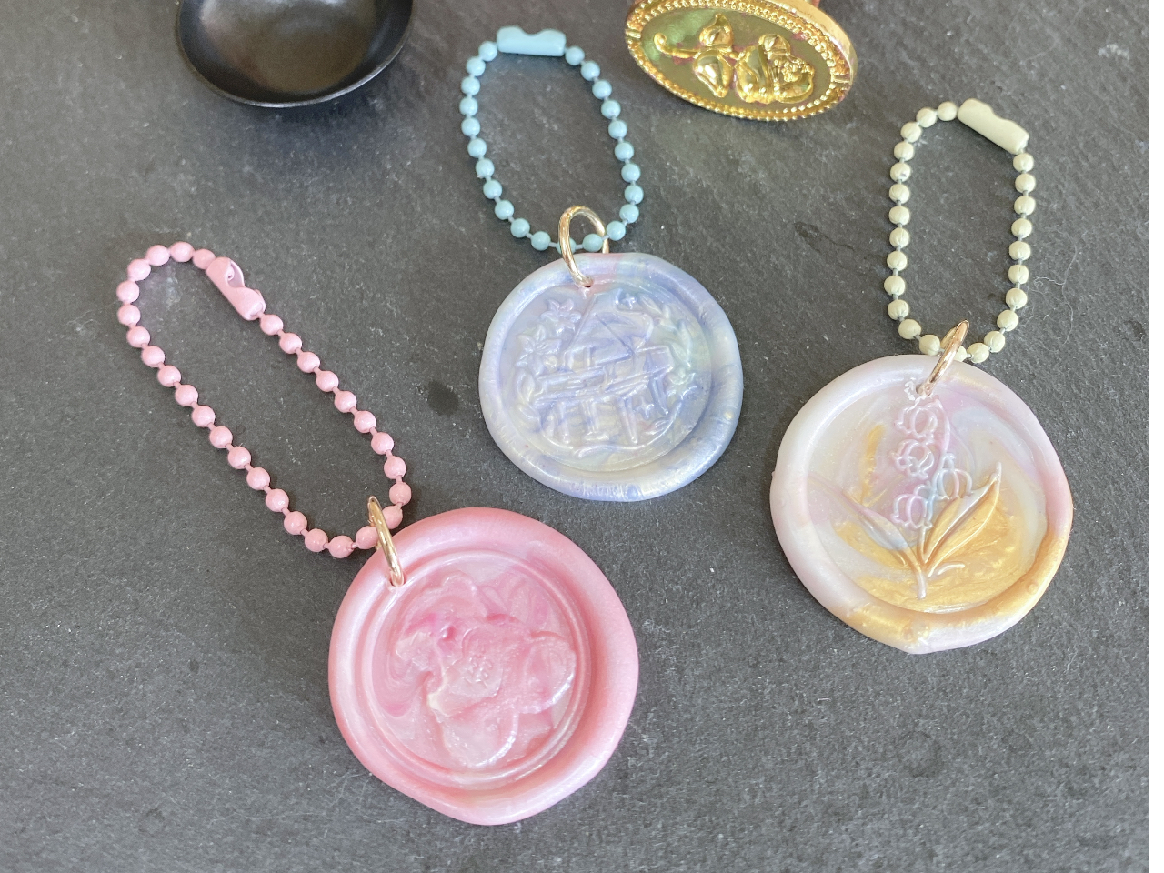 シーリングスタンプを4枚作り、その中のお気に入りの1枚をキーホルダーにします