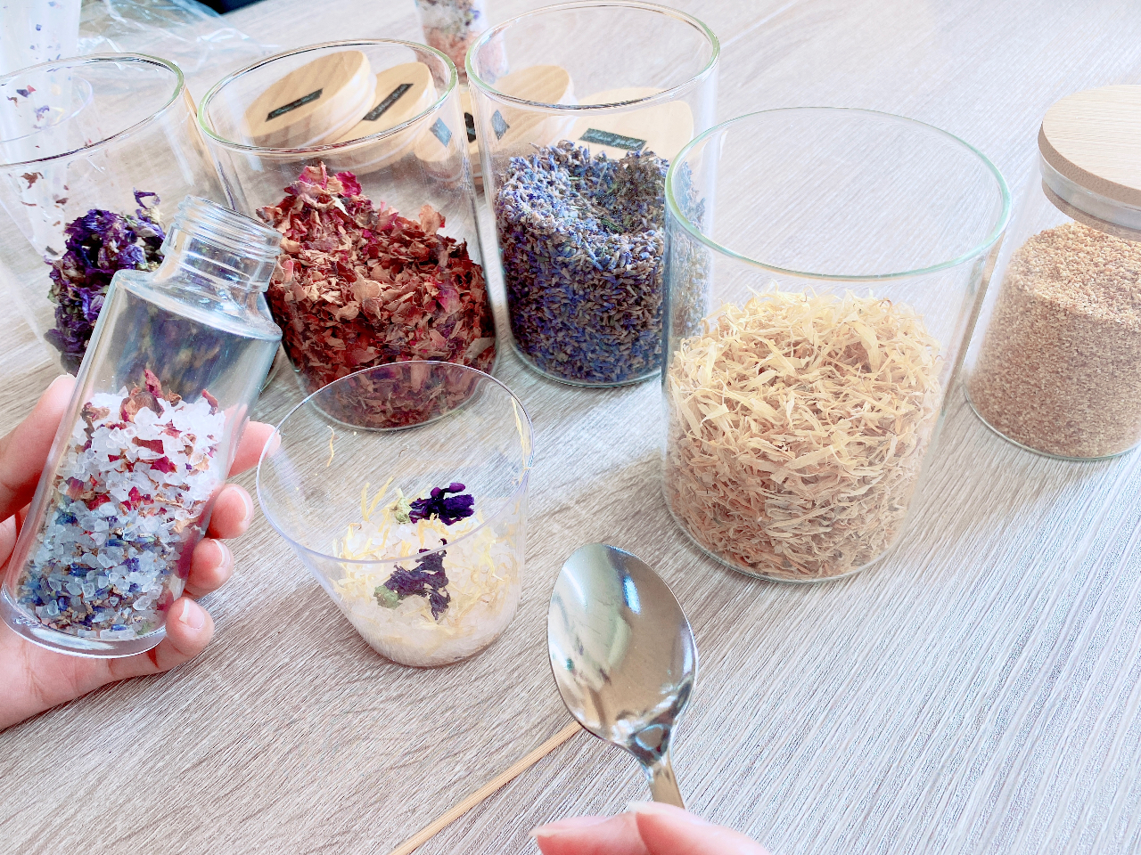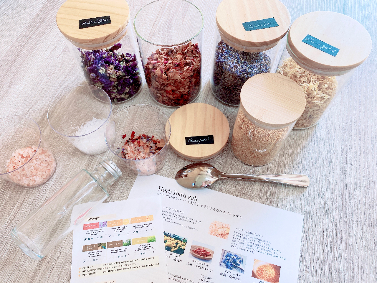 ヒマラヤ岩塩とハーブを組み合わせて贅沢なバスソルトと、7種類のレシピから作るアロマスプレー作り。