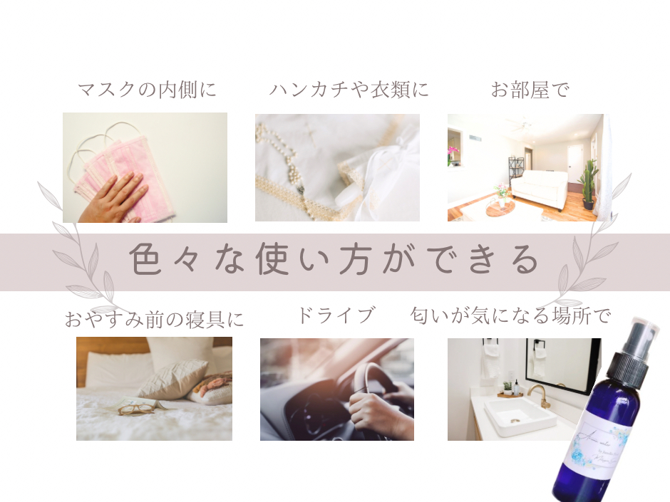 ハンカチ、衣類、ルームスプレーなどに使用いただけます。