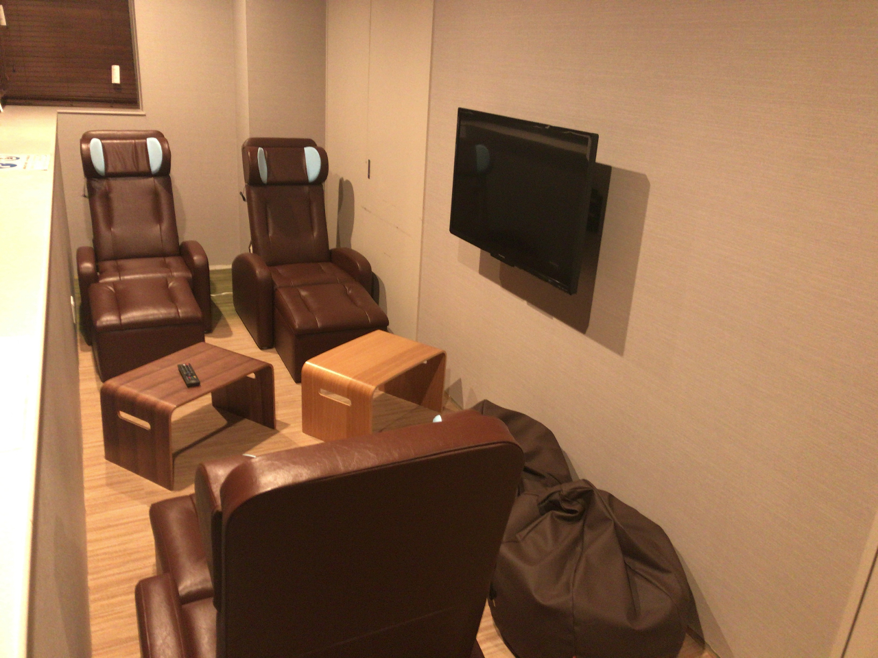 個室内には、証明、ソファ、テレビ、コンセント2個、USBポート式充電口2個を揃え、館内の高速wi-fiもご利用いただけます。(テレビ用のヘッドフォンは受付でお渡しします。)