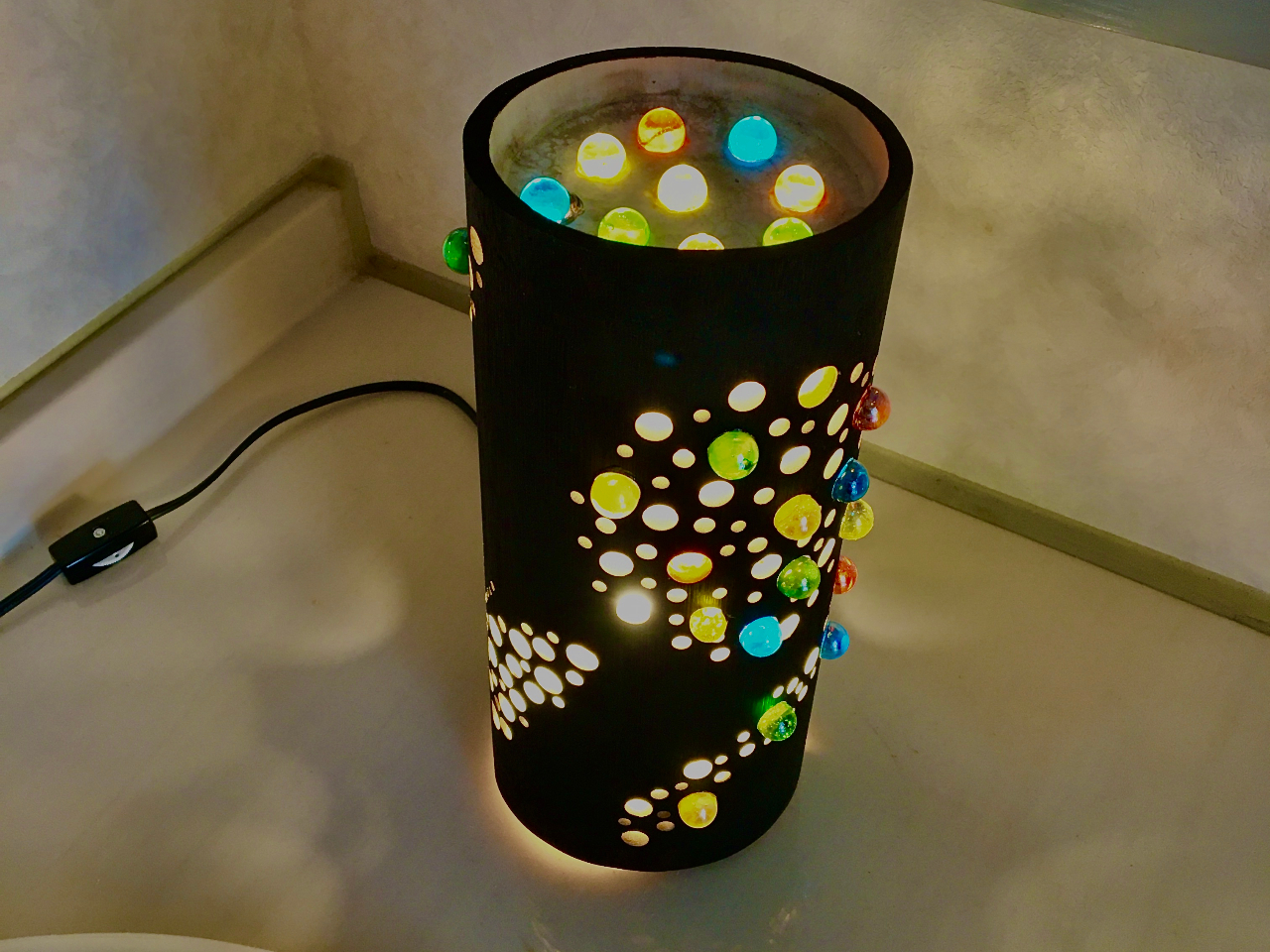 • 開けた穴にビーズやビー玉を貼ると、あかりの出方が変わって綺麗ですし、あかりが入っていない時や明るい時でも綺麗になります。