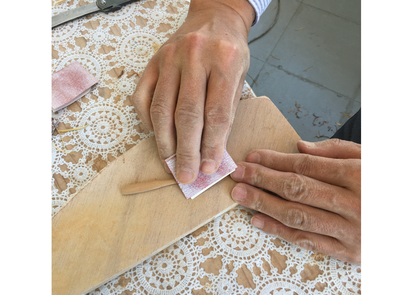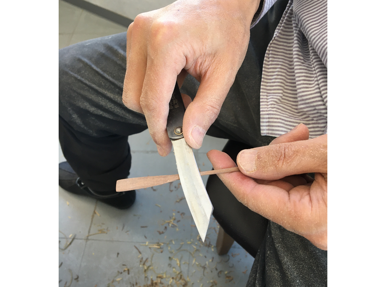 ナイフや彫刻刀で削り、紙やすりで仕上げていきます
