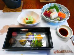 お夕飯です。これに茶碗蒸し、赤出汁、蛸釜飯、賀茂茄子の揚げ出し、わらび餅などついてました。