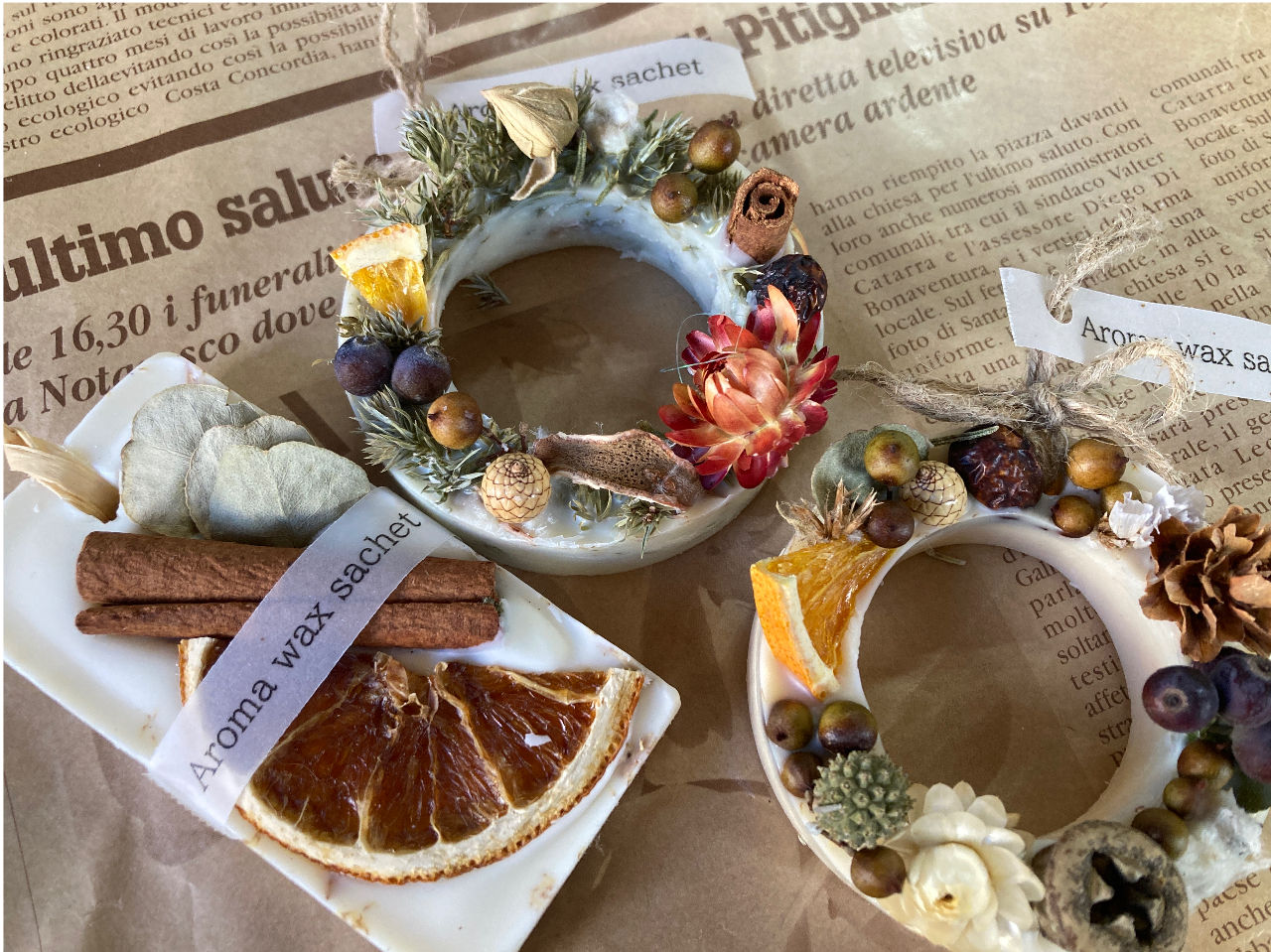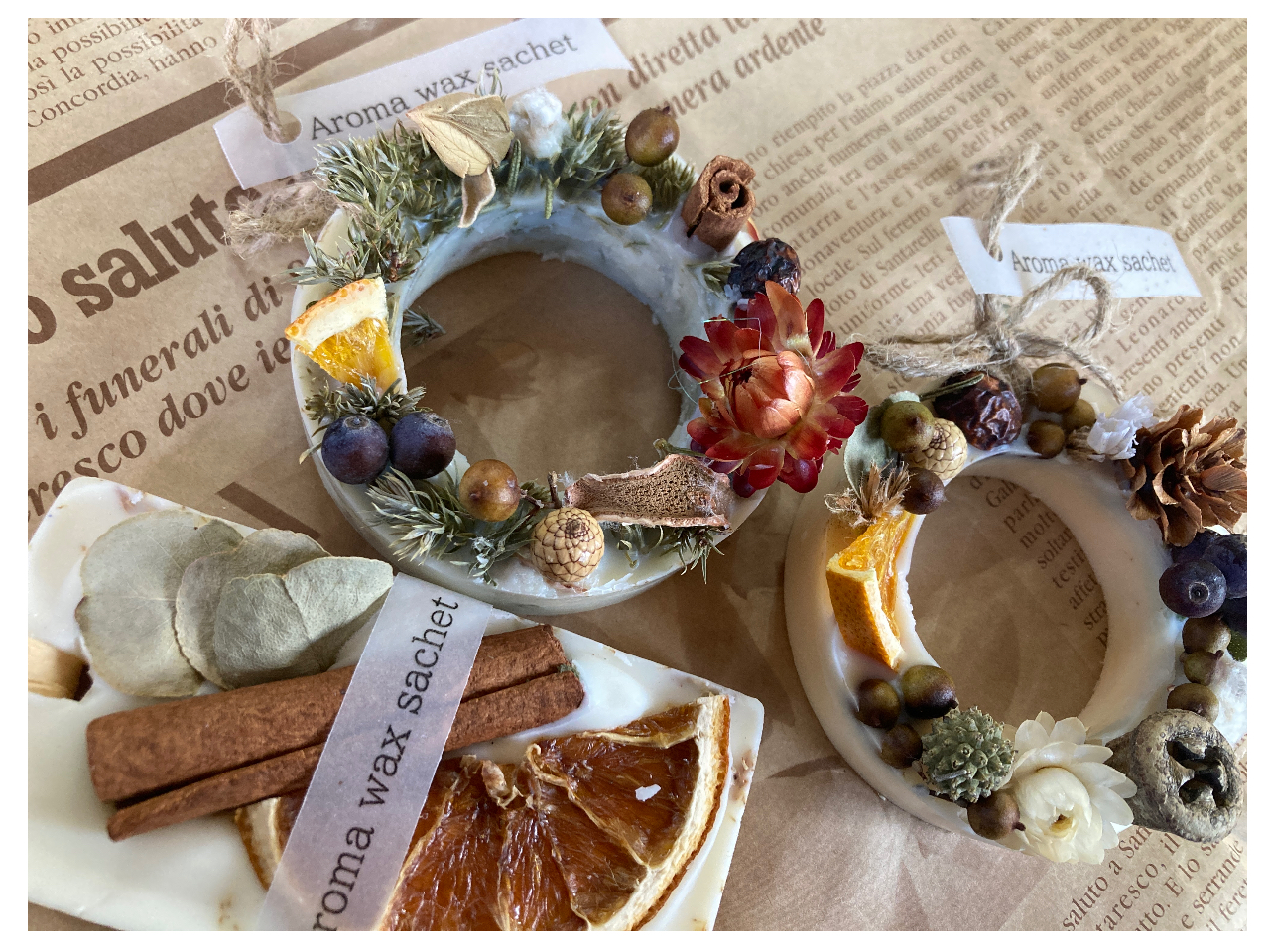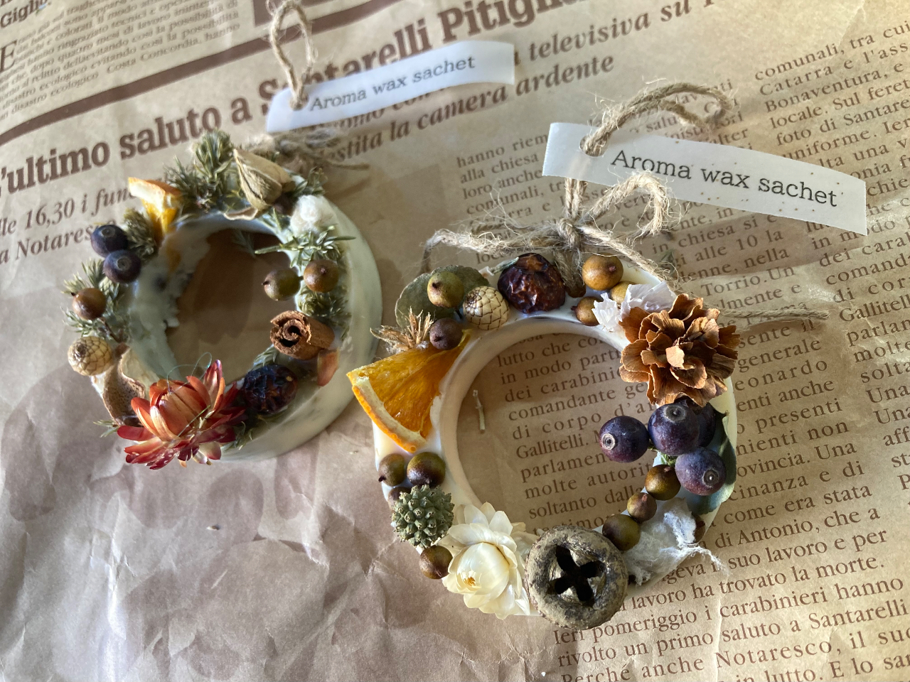 たくさんのハーバリウムなど素敵な作品に囲まれて、落ち着いたアトリエで作る事ができました。先生にはとても優しく丁寧に教えて頂きました。アロマワックスサシェ、初めて作りましたが、とても気に入ってます。