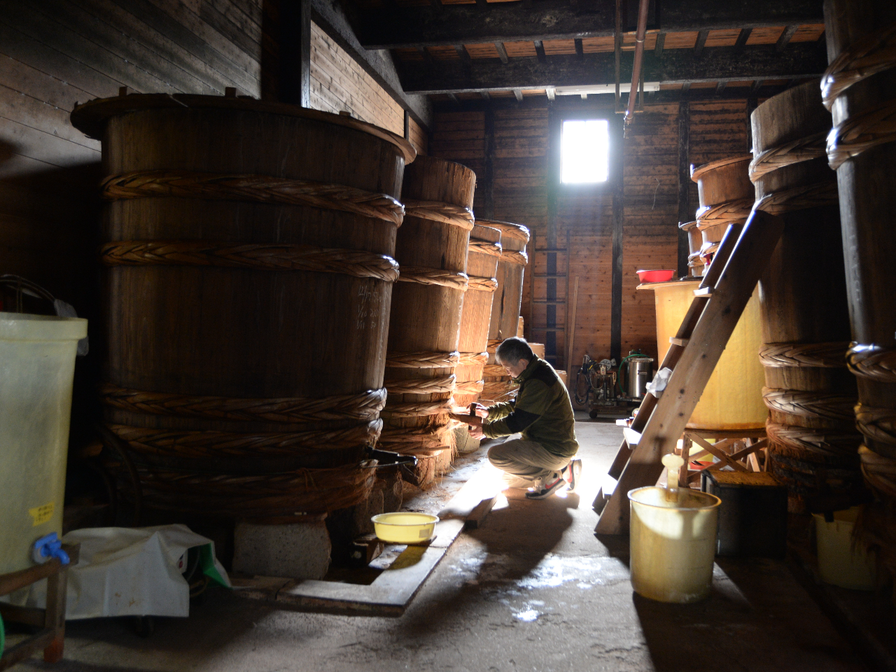 醤油蔵見学では大きな木桶がならび、醤油の香りいっぱいの蔵をご覧頂けます!