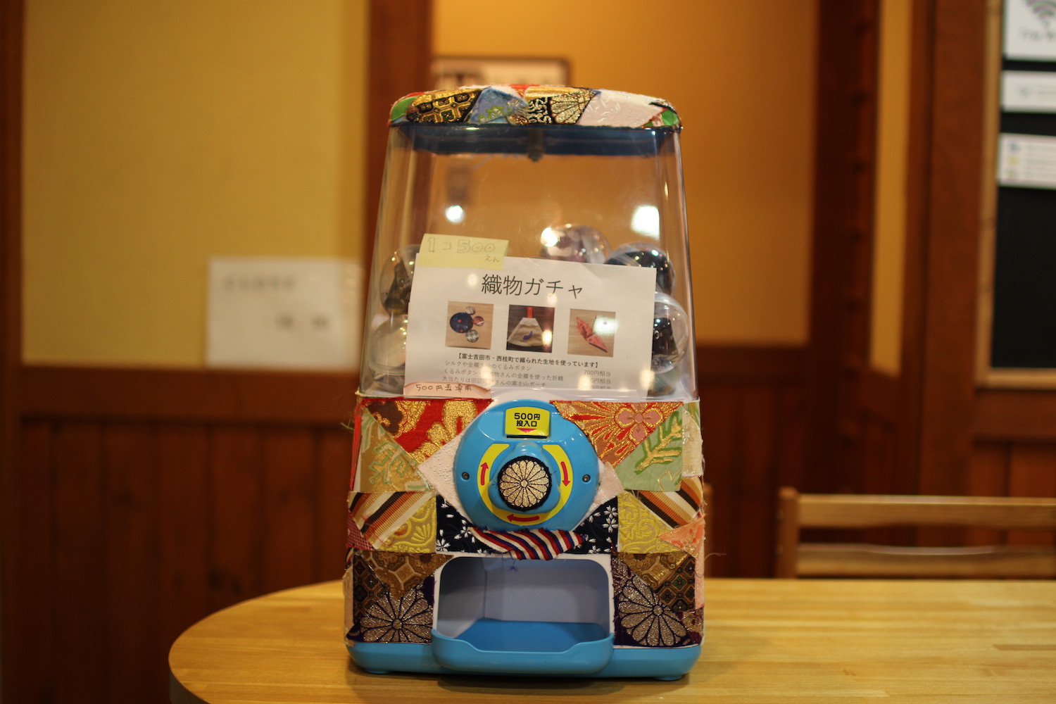富士吉田の名産品、織物のハギレやくるみボタンが入ったガチャガチャを回せます♪