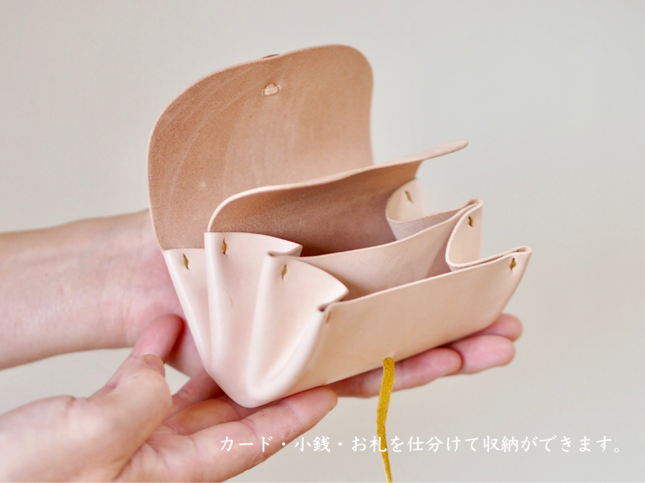 カードもちょうど収まる手のひらサイズです。レザークラフト