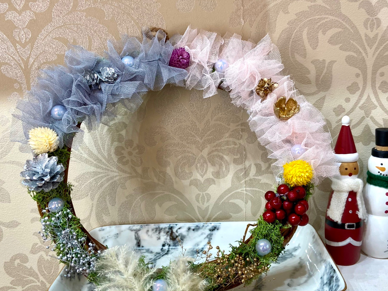 プリザーブドフラワーやドライフラワーやパールなどお好きな花材やパーツでオリジナルのしめ縄が作れますよ★フラワーアレンジメント・ガーデニング