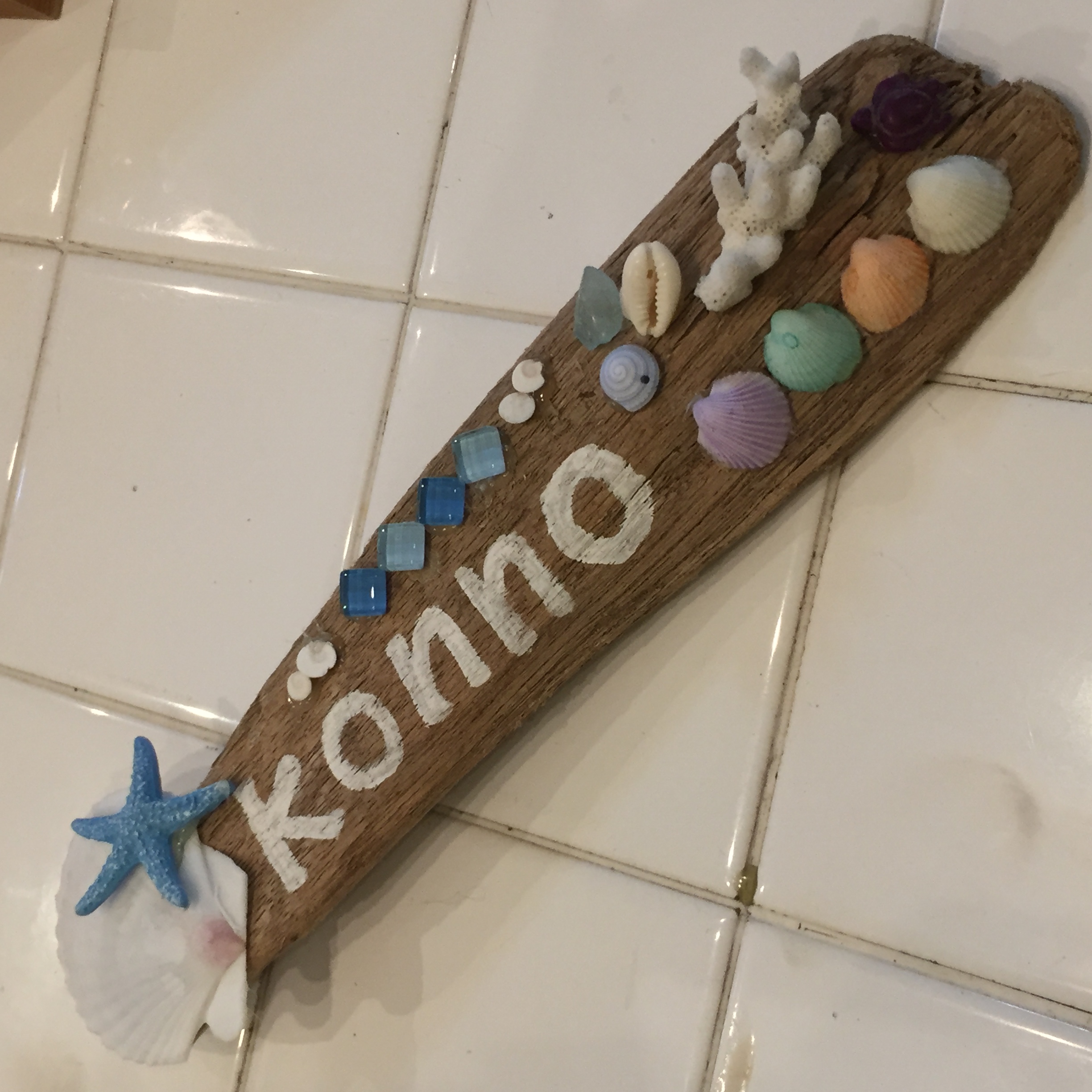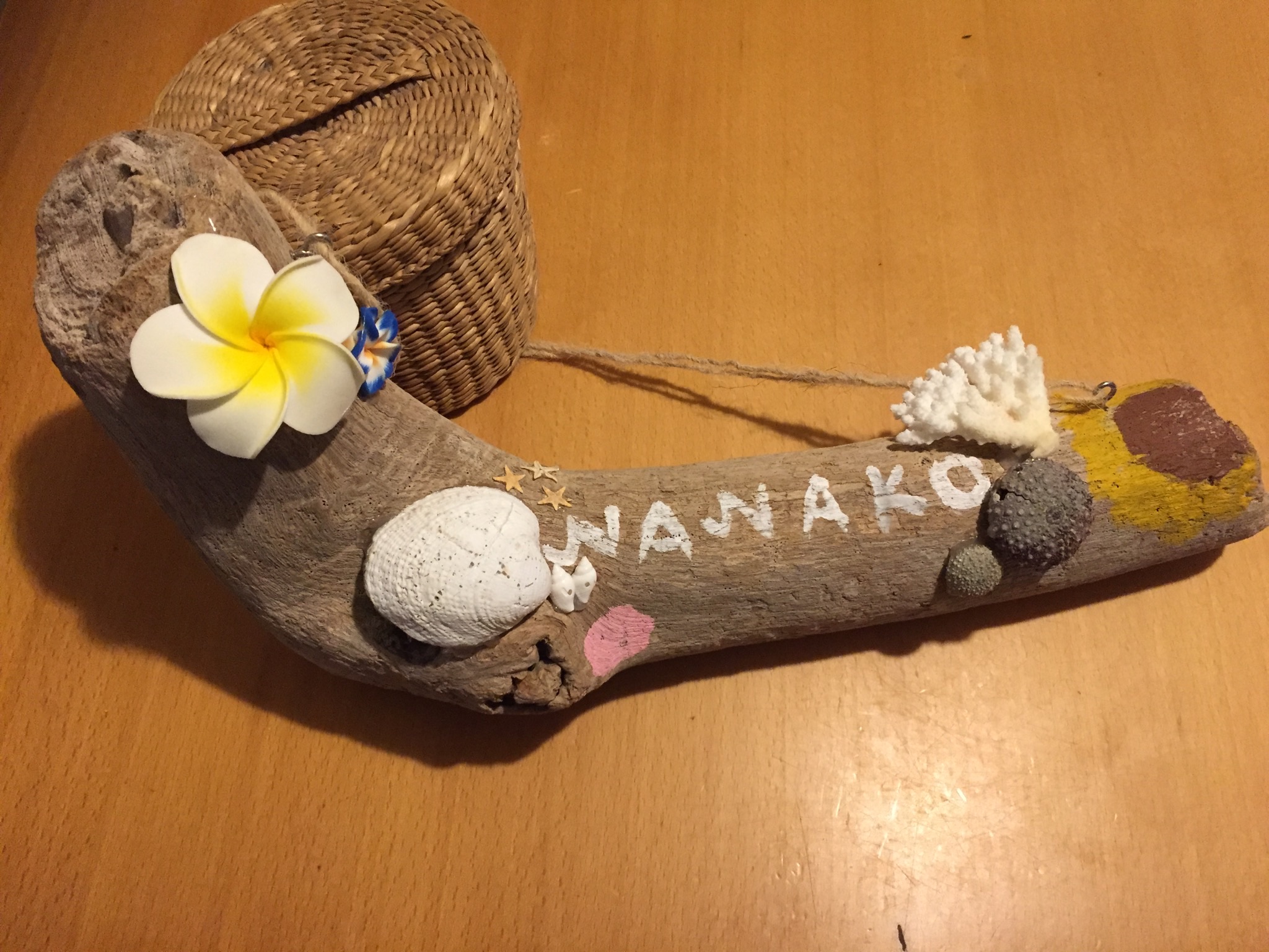 八丈島の海岸で集めた流木にペイントしてネームプレート作り。