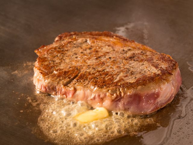 絶妙の焼き具合と熱々でのご提供が人気、シェフパフォーマンスコーナーにてお客様の目の前で焼き上げるリブロースステーキです。