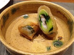 工夫のある組み合わせの料理(アナゴ+ズッキーニ→春巻き!+カレー塩!!)の数々はさすが。