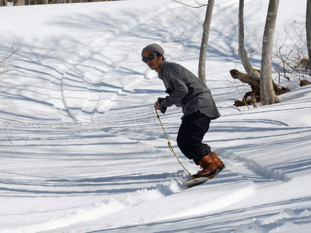 ◎固定用具も無く スノーブーツで気軽に出来る、一味違ったパウダーライディングで