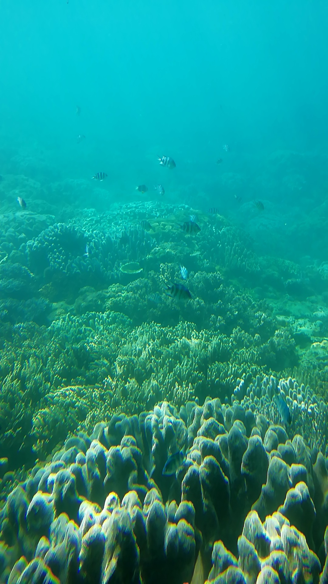 出航後まずは水中鑑賞、きれいなサンゴや熱帯魚がたくさん、ウミヘビも見えました。当日は晴天だったので太陽の光がきらきらと差し込み、とても美しい眺めでした。