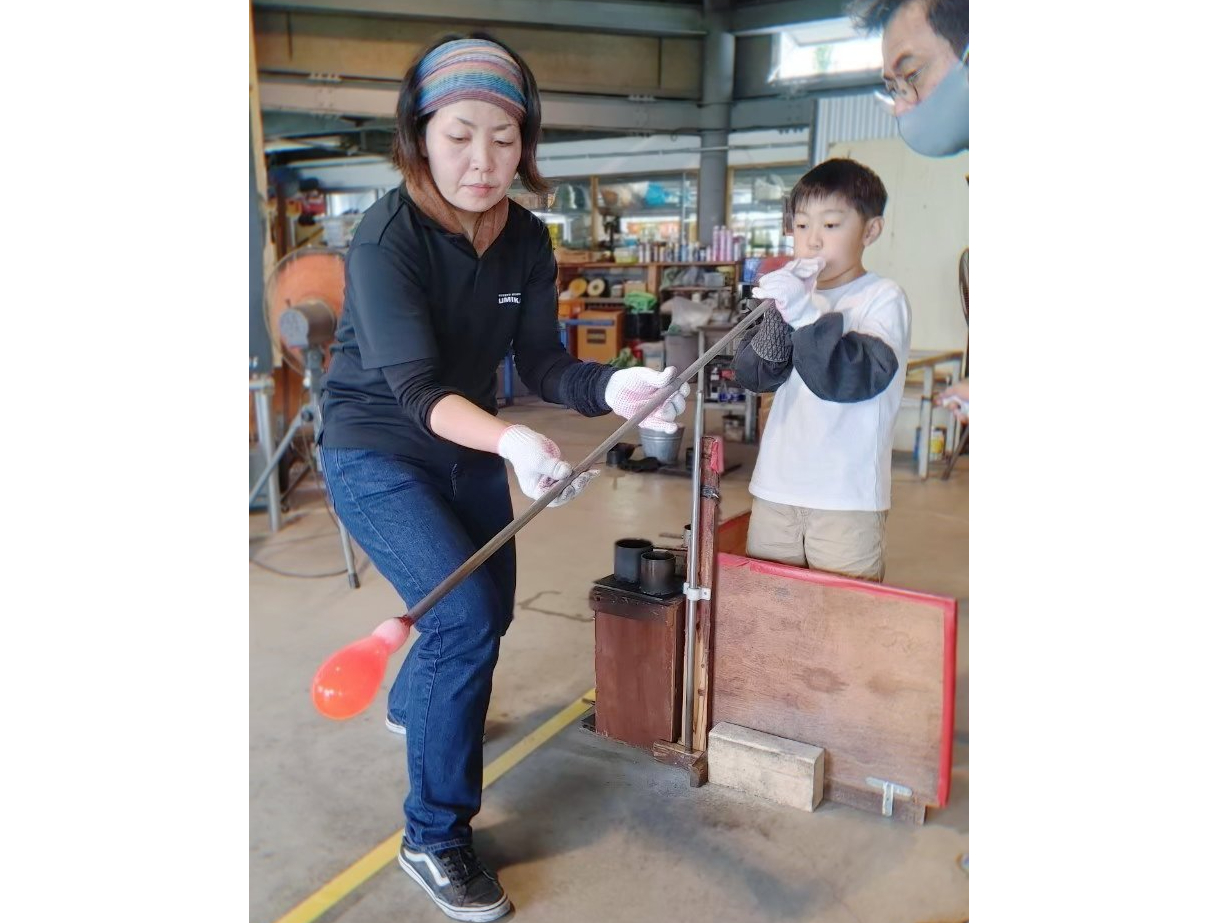 体験内容はお好みのデザインを選んでいただき、工房内で吹き作業と口回りを広げる作業となります。