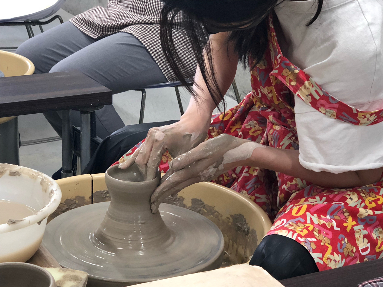ついに陶芸体験のスタート。ろくろに据え付けた土からゆっくりと形を作っていきます。
