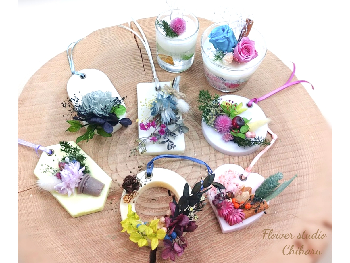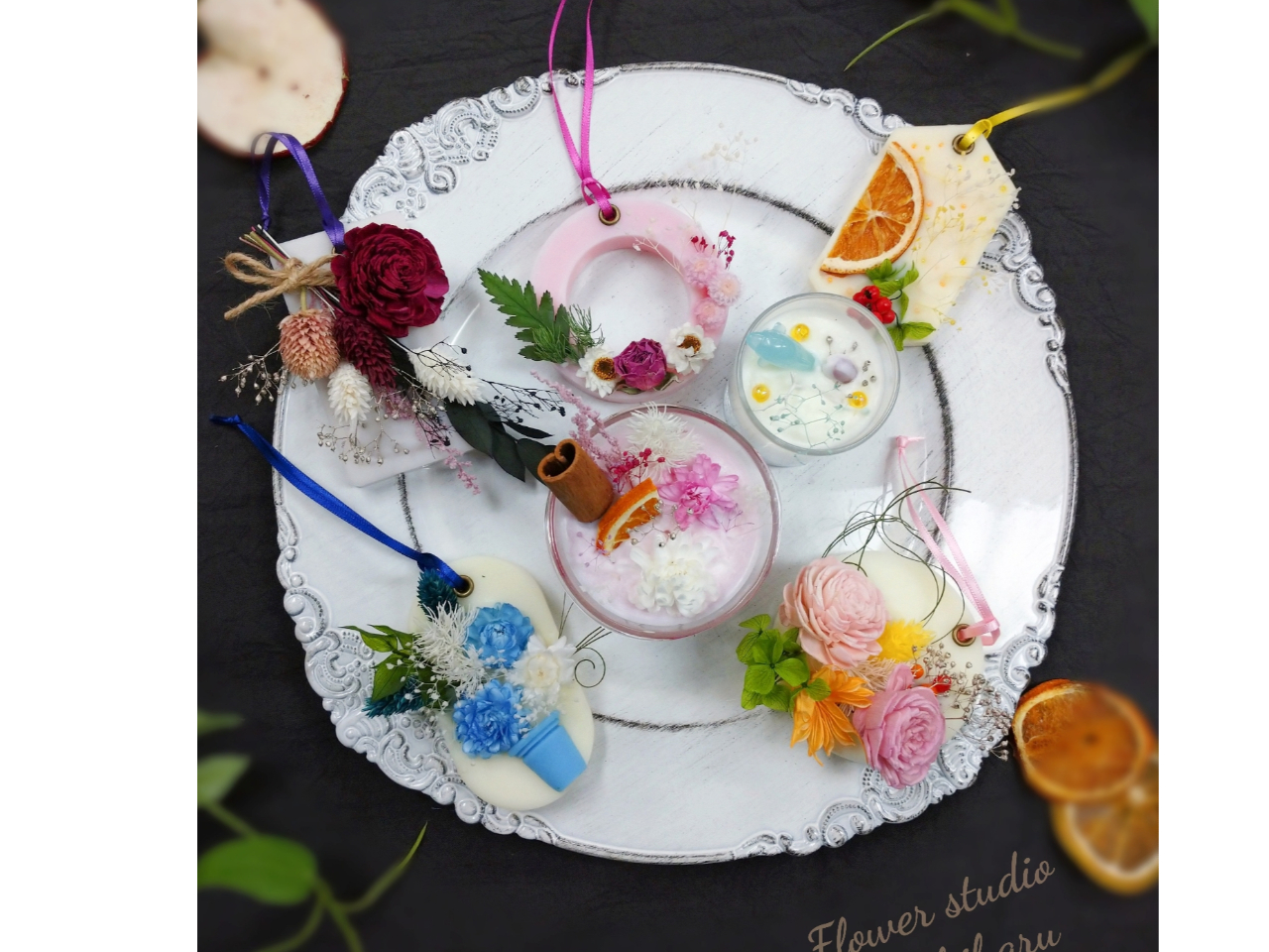花材、香料、顔料は自由にお選び頂きます。所要時間は花材選びにかかるお時間により個人差があります。