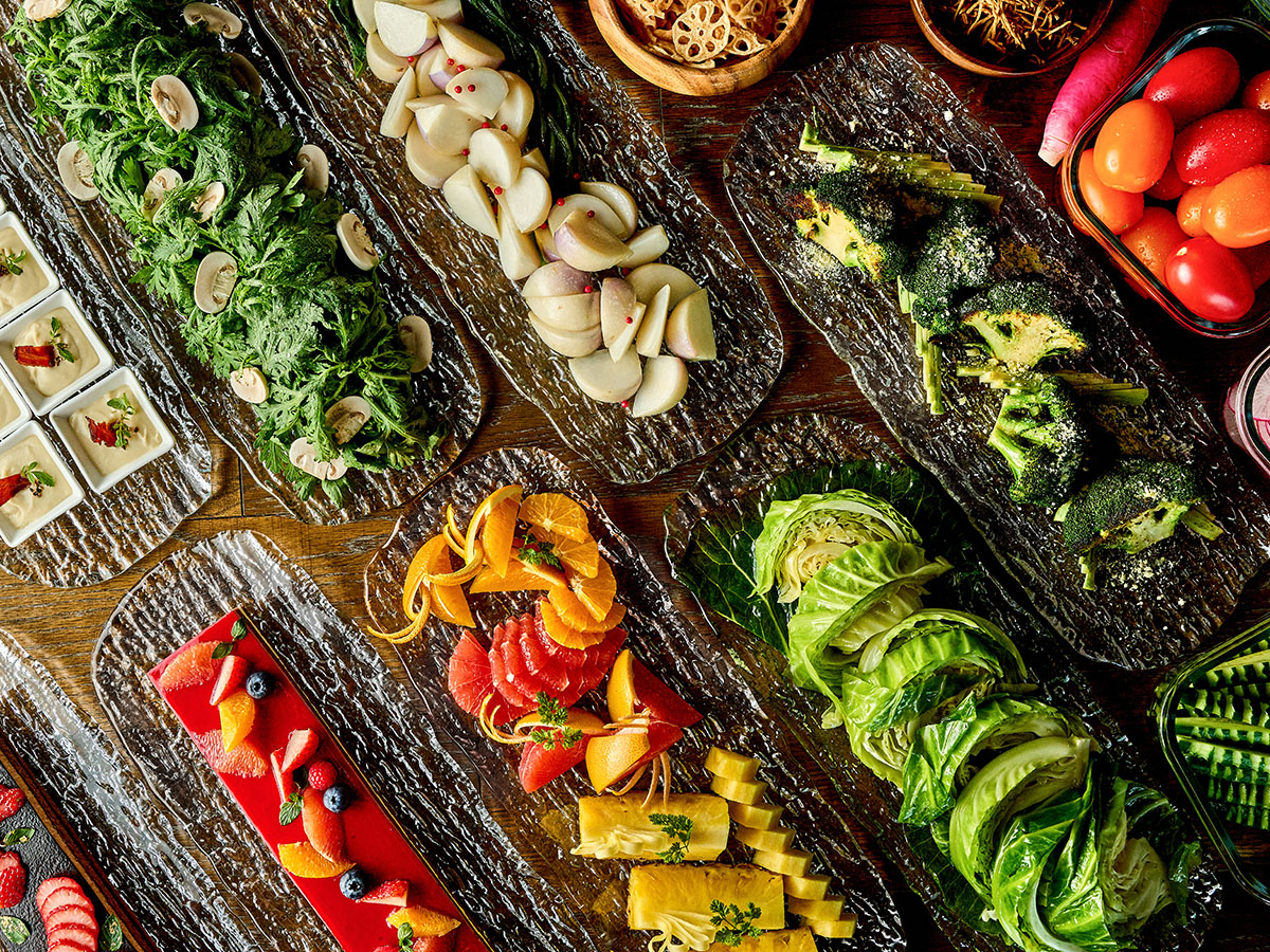 羽田空港と多摩川を望む絶景の中で、ビーフ料理をメインに、川崎市のもりもり卵を使用した温度卵のほか、地元の新鮮野菜を楽しめるベジタブルコーナーや、スープ・デザートがお好きなだけ堪能できるハーフブッフェ。