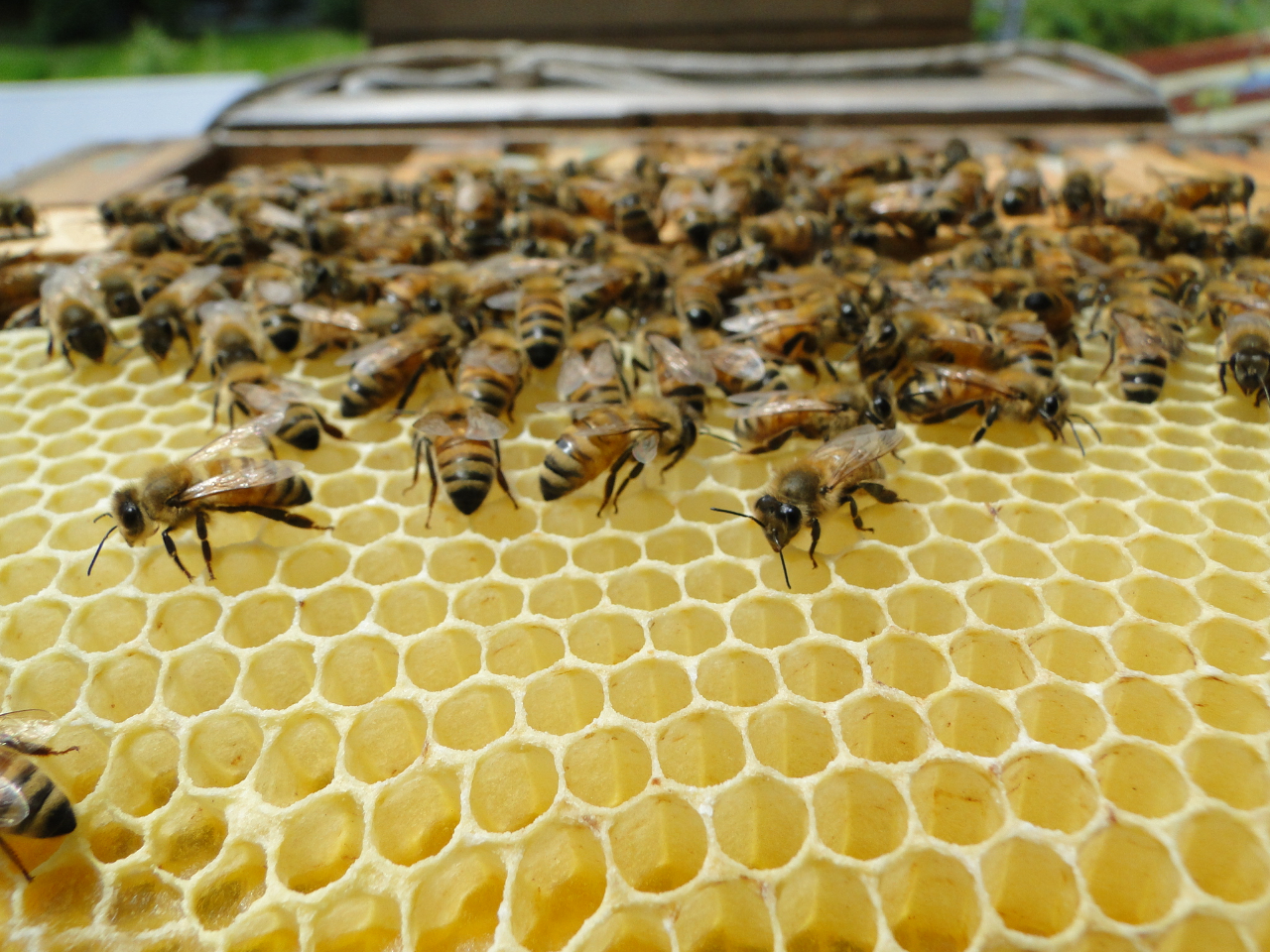 巣箱から取り出したみつばちの巣枠にビックリ