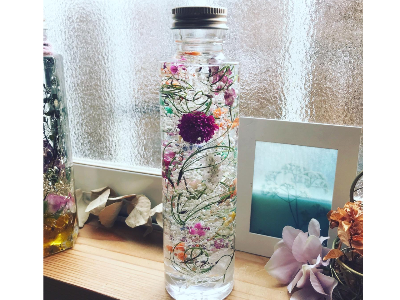 ハーバリウムとは特殊な液体にドライフラワーやプリザを入れ、液体の透過性や光の屈折で植物自体の美しさをデコレーションし数か月から数年の保存が可能なインテリアです