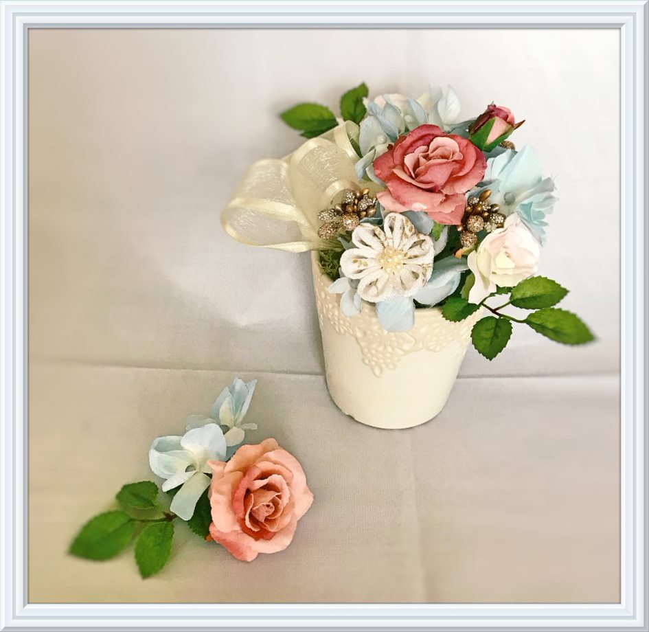 日本古来のちりめん布を伝統の技法でせいさくしていく『つまみ細工』とアレンジメントフラワーを組み合わせて、