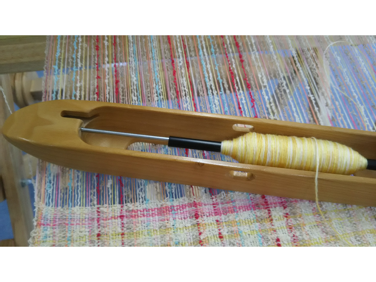 あらかじめ幅約35cm、長さ70cm程の縦糸を織機に張って準備してあるので、そこに好きな色の横糸を選んでもらい、縦糸の間をくぐらせて織っていきます。