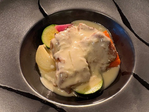 博多和牛入りハンバーグをオープンキッチンの炭火で余分な脂を落としながら焼きあげ、肉の旨味を閉じ込めたメインディッシュを心ゆくまでお楽しみください。