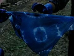 白いバンダナサイズの布に、白く抜く部分をイメージして輪ゴムを縛り、藍の液にジャブジャブ浸して、水ですすぎ乾かすだけ