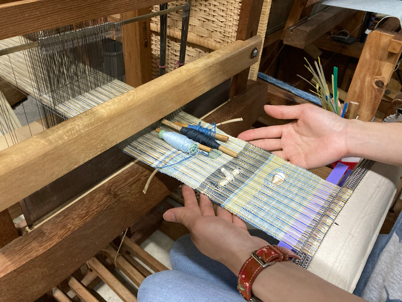 西表島の大自然のもと、草木で染めた色糸を自由に選んで機織り体験ができます。