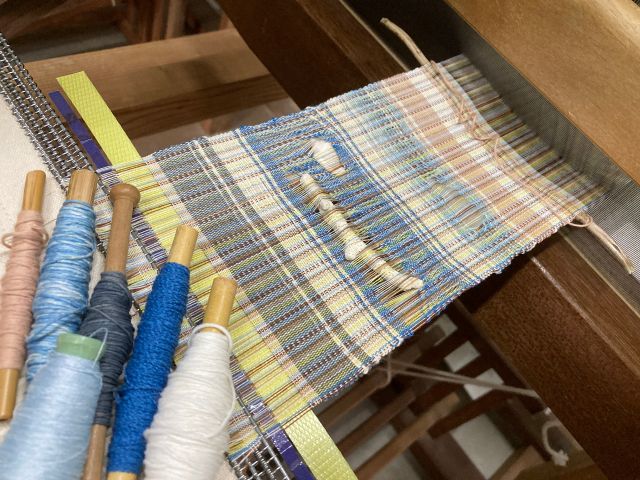 お気に入りの染め糸に、貝殻とサンゴを織り込んで