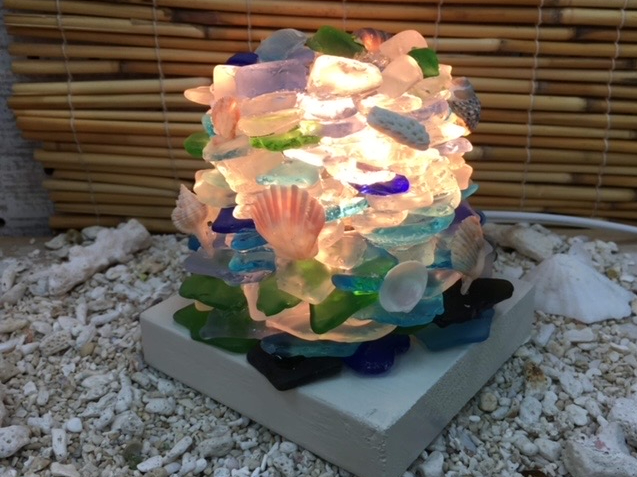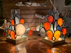 貝殻やビーチガラスをはんだ付けして、ステンドグラス風ランプシェード作ります。