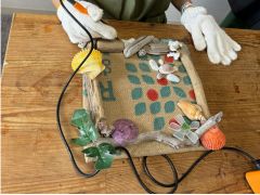 板にドンゴロスや流木をつけてタペストリー作りをします!