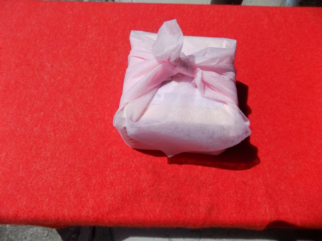 7:「ケーキ型苺大福」を可愛い「狸の焼き印付の木箱」に入れ風呂敷に包みお持ち帰り。