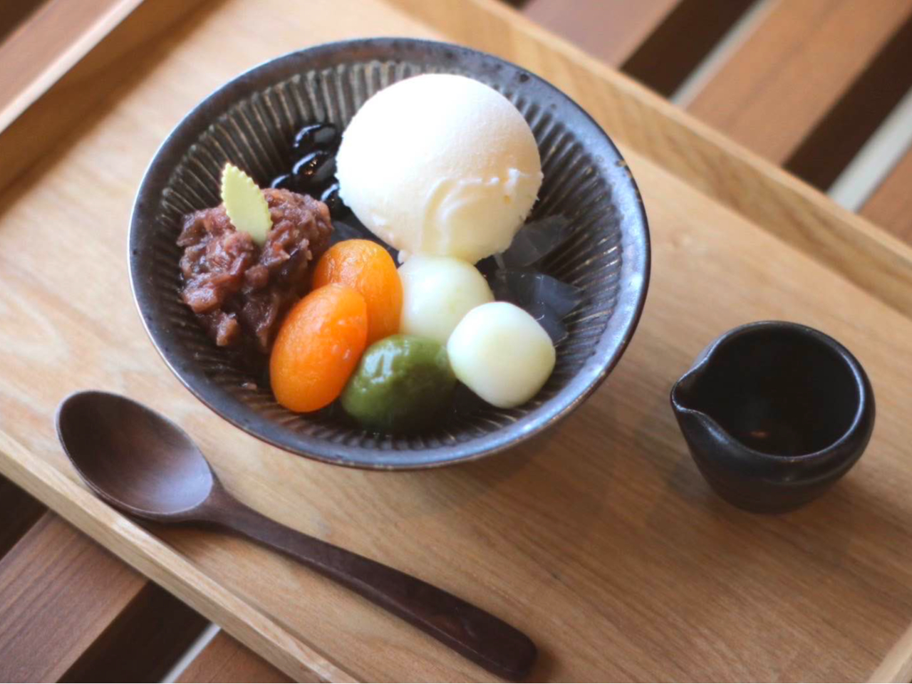 発酵餡を使用した白玉あんみつです。アイスクリームも自家製で、あっさりとしたおいしさ。