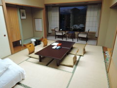12階建てのホテルで、ロビーは二階にあります。6階の和室に宿泊。部屋の造り、特に天井が前泊のホテルに似ていました。部屋からの眺めも良かったです。会席料理の夕食にアワビが出たのにはビックリ!品揃えはまずまずで味が良かったです。大浴場は三階と二階にあり、三階が午後10時まででこちらに。ラドン成分が入った温泉で、露天風呂は八角形の湯船。屋根天井も八角形、天井を眺めながら入浴するのがオススメとのこと。朝食は別会場でブッフェ式、メニューの種類はまあまあで、トマトのスムージーがユニークでした。