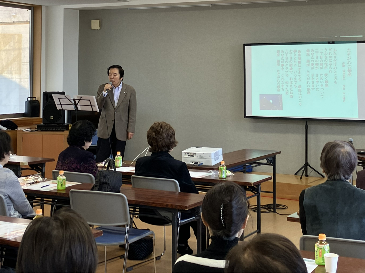 ムード歌謡で有名な東京ロマンチカのリードボーカル宮内ひろしさんが講師を務め、昭和歌謡を中心にした曲を皆さんで一緒に歌う歌声サロンに参加した後、おぢやのグルメを居食亭東忠で味わっていただくコースです。