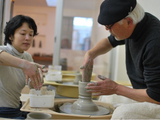 ◎最初の1個は先生や他の体験者と一緒にお湯のみ作りで小手調べ・2個目から自由制作