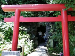 猛暑の中歩き続けるあじさい巡り、唯一ひんやり感を味わえた弁天窟、弁天堂の裏手の赤い鳥居が入口になります。