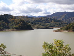 月山湖の周囲は紅葉で木々が色付き初めた頃