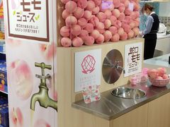 2Fお土産物屋しずおかマルシェで、蛇口から出てくるももジュースが楽しめます。フードコート奥にはカードラウンジがあり、落ち着いた空間でゆったり時間できます。