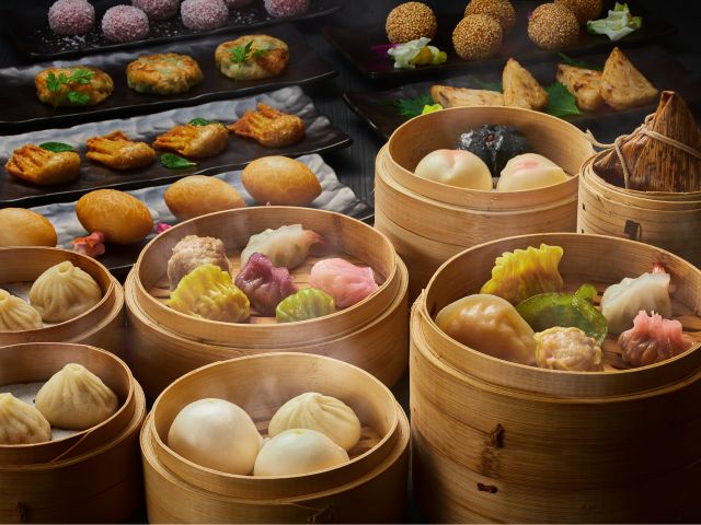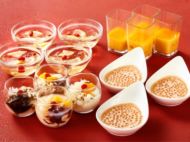 黒酢の酢豚、餡掛け焼きそば、炒飯、春巻き、麻婆豆腐、中華粥、サラダ、フルーツ各種、マンゴープリン、杏仁豆腐、胡麻団子や九龍球、香港カステラなどのデザートもご用意しております。