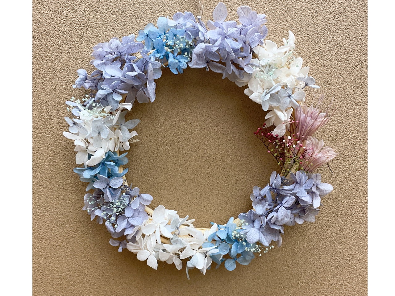 温かみがありながら半永久的に楽しめるかわいい紫陽花フラワーリース