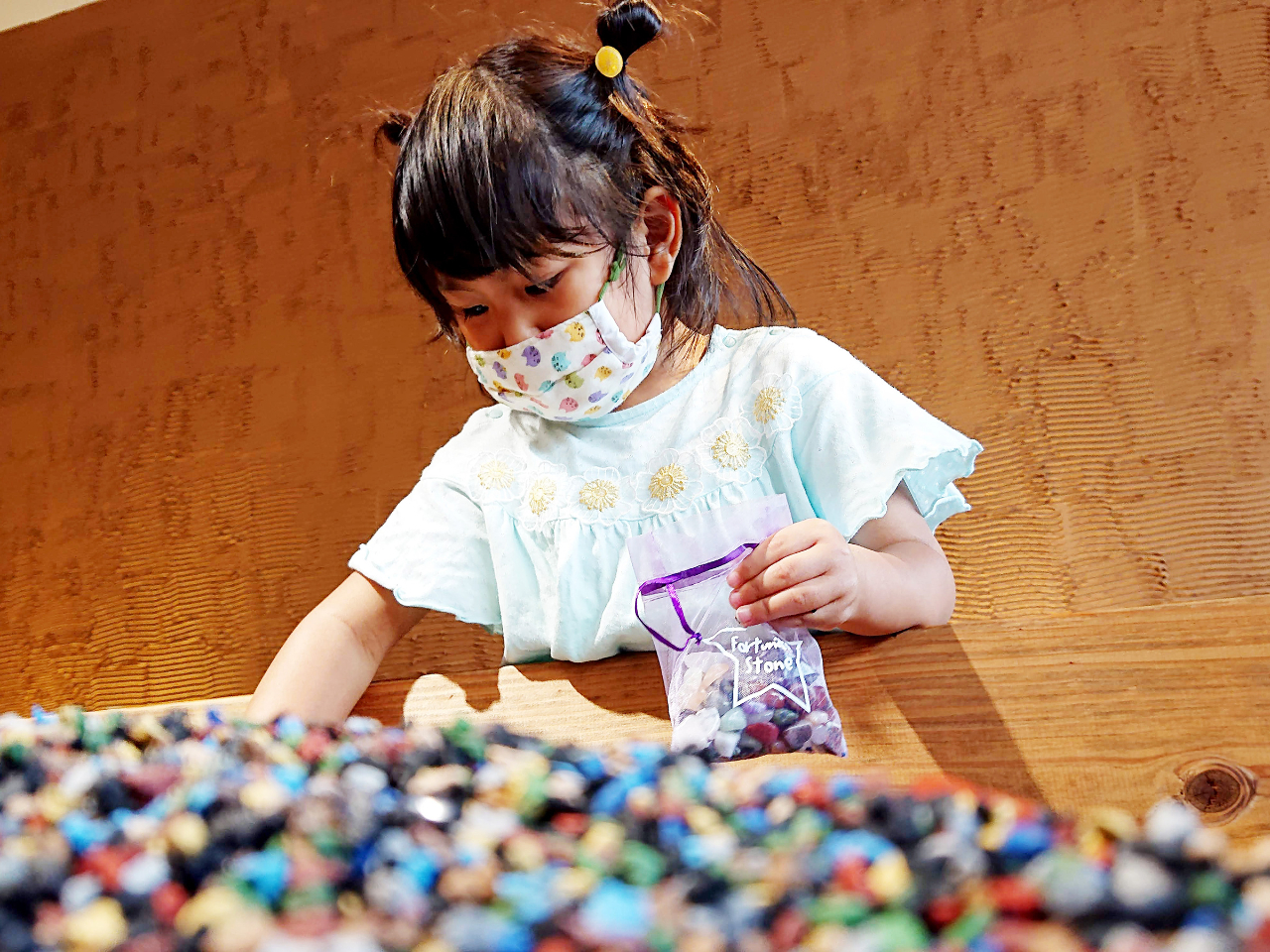 ゴムチップの中に埋められた天然石(パワーストーン)を制限時間以内に探しだし、