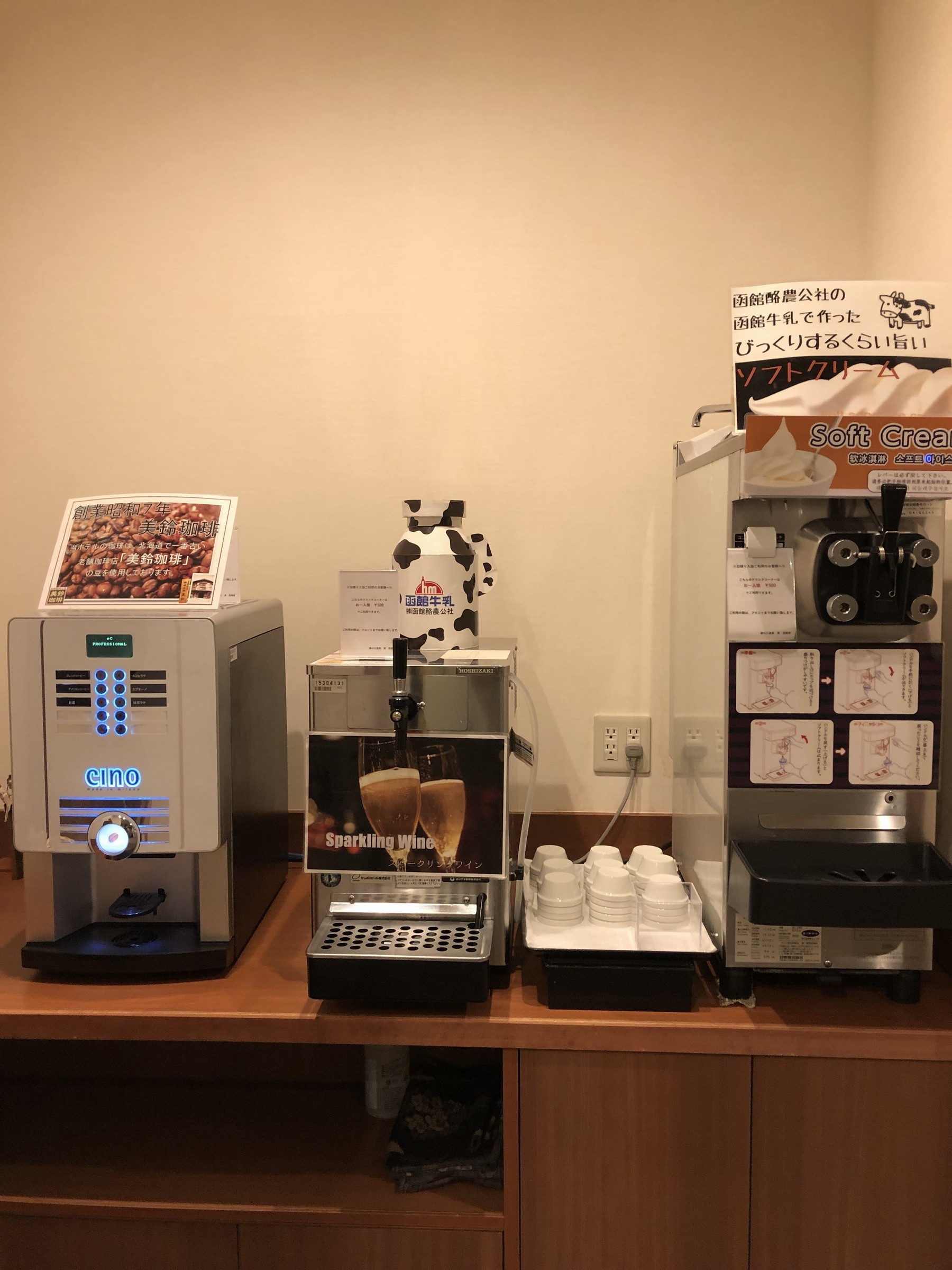 函館の老舗「美鈴珈琲」のホットコーヒーやスパークリングワイン、函館牛乳のソフトクリームを楽しめるフリードリンクコーナー