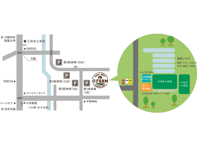 車でお越しの方:練馬インターから川越インターまで、約20分関越自動車道を走り、そこから国道16号線経由で約10分のところに@FARMはございます。