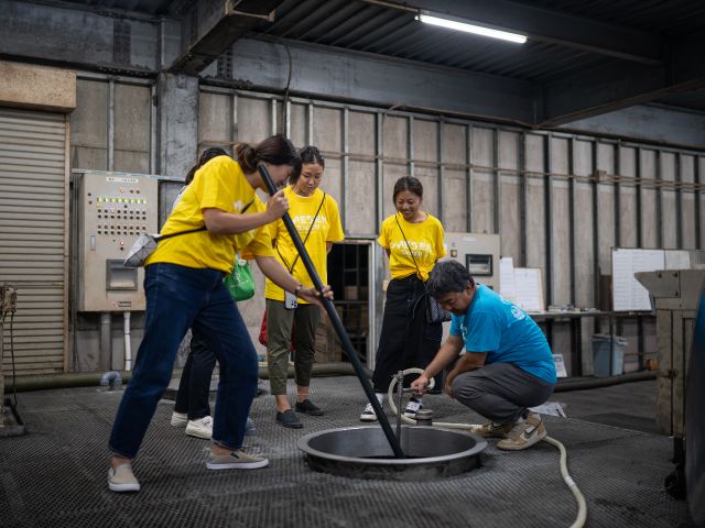 泡盛づくりに欠かせないもろみを作る重要な工程に参加、大きなタンクをかき混ぜます。