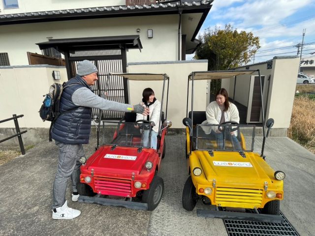 オープンタイプのかわいいバギーに乗って、斑鳩の風景と美味しい空気を存分にご堪能ください。