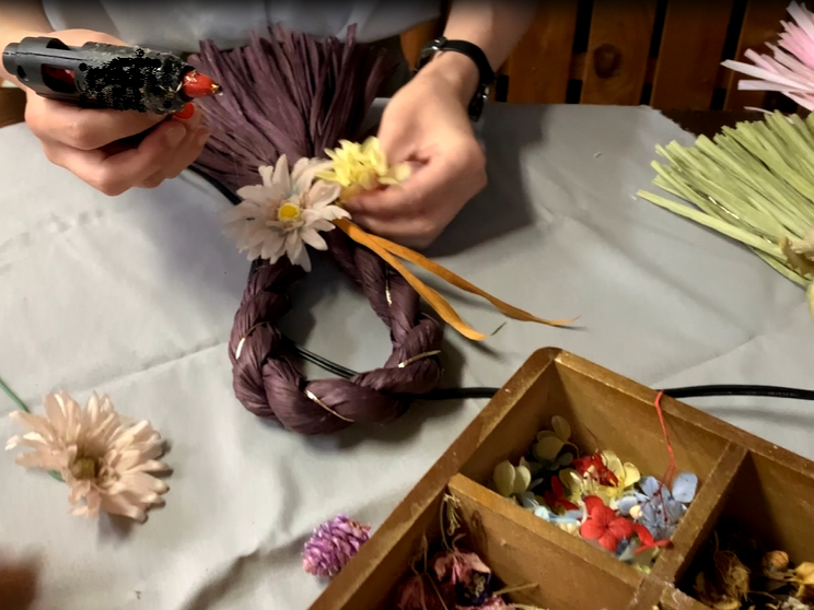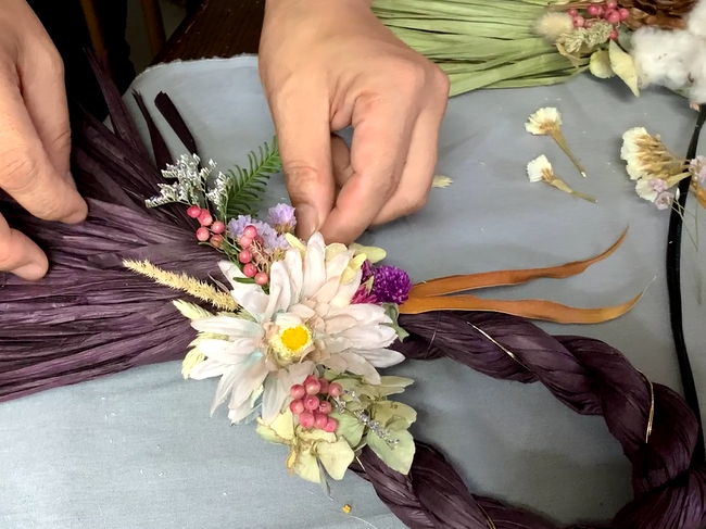 ・さらにドライフラワーを1つずつ付けていくもよし、まとめて付けるもよし。デザインに迷ったら先生にアドバイスをもらいましょう!