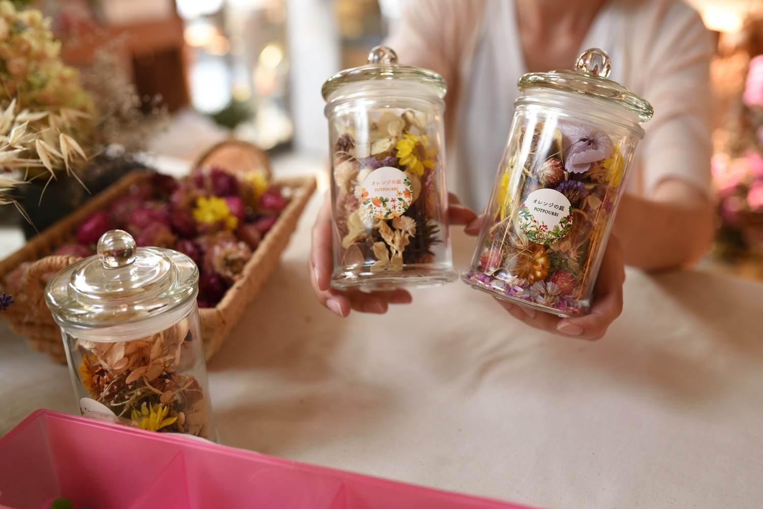 いかるがの里で育った花のドライフラワーで作るアロマポットです。自分で好きなように花を詰めることができるので、愛着のわく作品になること間違いなし!